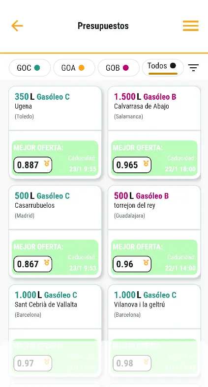 El mercado del gasóleo es un mercado muy volátil, los precios pueden fluctuar con gran rapidez de un día para otro y cada distribuidor puede decidir el tiempo que su tarifa estará en vigor. Es por ello que los presupuestos no tienen vigencia de días, sino de horas (mínimo 4 horas). Si dentro de ese plazo no puedes confirmar tu presupuesto no ocurrirá nada, el presupuesto se quedará sin confirmar y deberás solicitar otro a mayores. Ten en cuenta que si no confirmas nunca los presupuestos, los distribuidores de tu zona podrían verse desincentivados a ofrecerte sus tarifas, dado que su objetivo es siempre conseguir una venta.